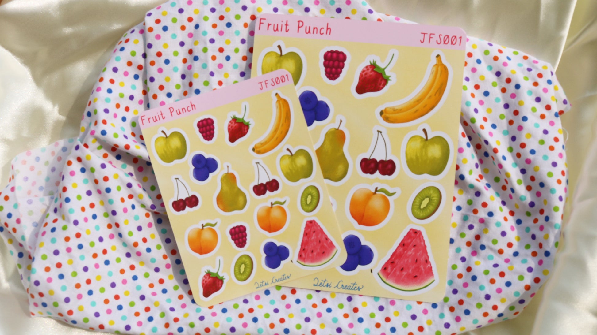 A sticker sheet full of fresh fruit: apple, raspberry, strawberry, banana, pear, cherries, kiwi slice, watermelon slice, peach and blueberries.